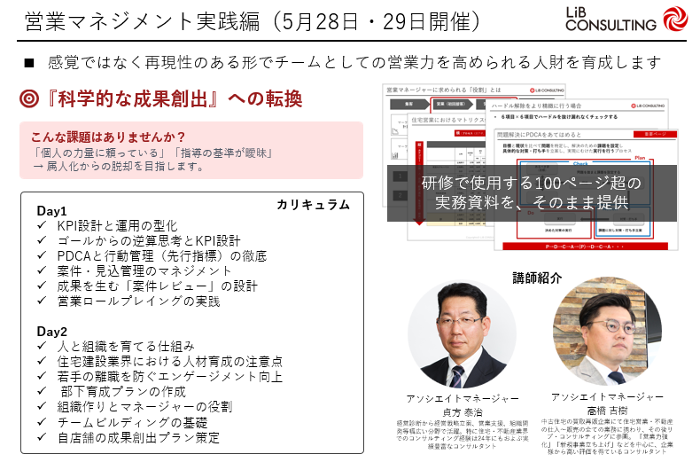 本プログラムは、昨年度【満足度98%】を記録した、住宅事業の「営業」と「マーケティング」に特化したマネジメント強化合宿です。