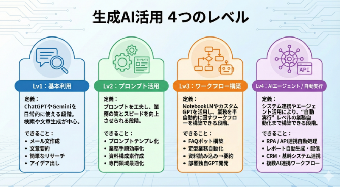 多くの企業が「Lv1:文章作成・検索」など個人利用で止まる一方で、成功企業はすでに「Lv3:ワークフロー構築」で業務そのものを変革を進めています。