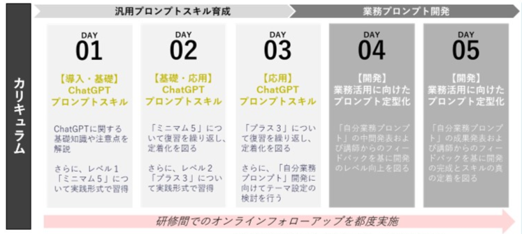 インプットとアウトプットを繰り返す3か月の実践型研修で生成AI(例:ChatGPT、Gemini、Copilotなど)の汎用スキルを修得。