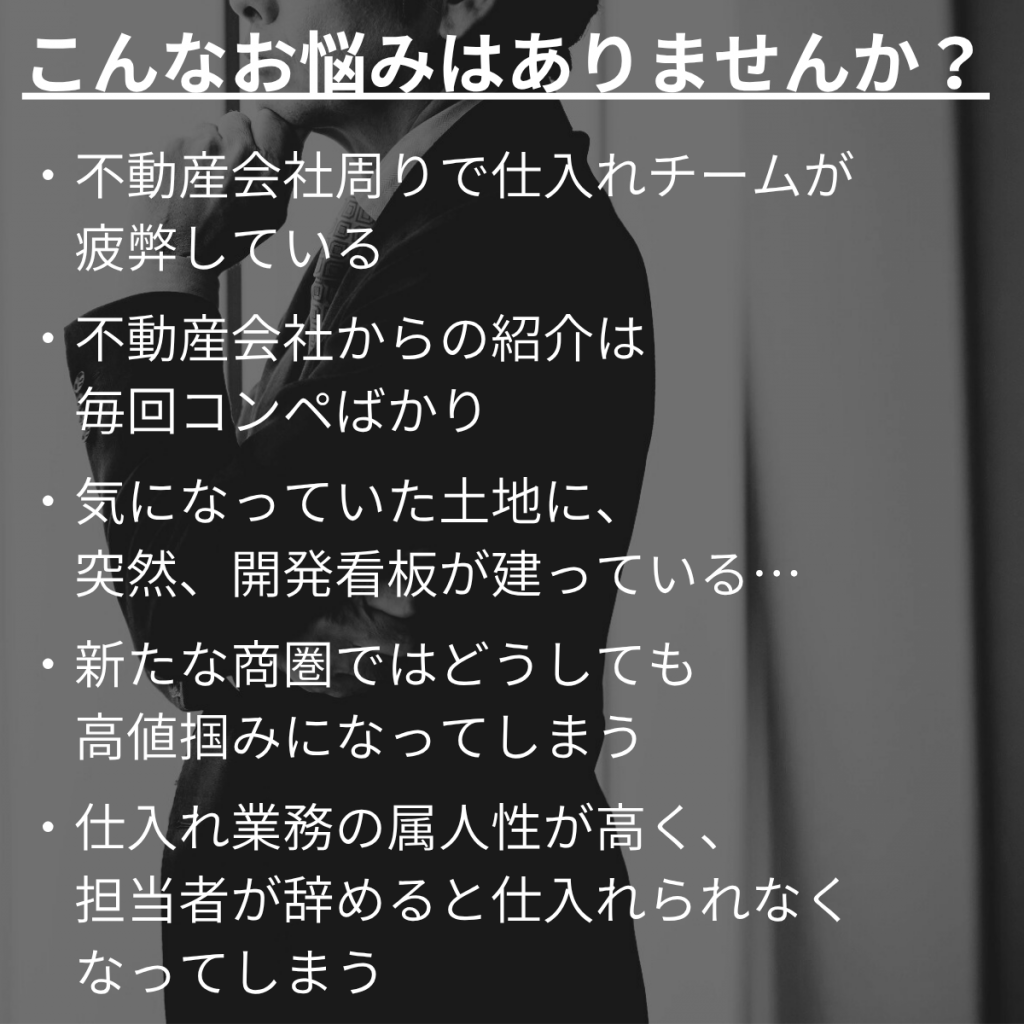 事業の決め手となる「土地仕入れ」について、こんなお悩みはありませんか?